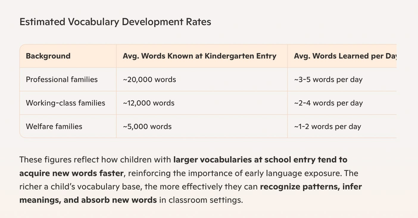 - Many of the students you encounter in the Headstart or kindergarten class have not had the advantage of having parents who have read to them daily, or engaged in high quality conversations with them, or provided other rich language building experiences. So when they enter kindergarten, they have weak vocabularies. The size of a person’s vocabulary plays a direct role in reading comprehension, academic achievement, and lifelong learning. This is because it is harder for them to learn new words, and so they quickly fall behind in school. So you can really HELP these students by using your time with them to build their foundational (basic) vocabulary that their parents did not provide,